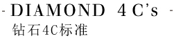 在购买钻石婚戒时,最重要的选择标准就是“4C”。“4C”是指克拉(Carat)、颜色(Color)、净度(Clarity)、切工(Cut)这4个评价标准的英文首字母总称。 钻石的价值高低即是决于“4C”的状况。